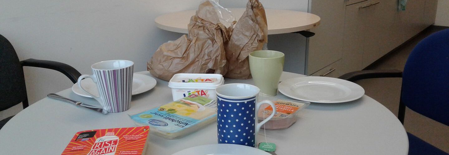 Sometimes, (university) life happens. And book club members have trouble attending due to conflicting schedules, exam preparations, and paper deadlines. But that does not mean that a book club session gets cancelled—sometimes we just make do with whatever small discussion round we have. This can even get really cozy as this image from a miniature discussion session at the English and American Studies Department’s kitchenette shows.